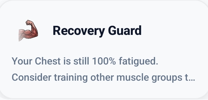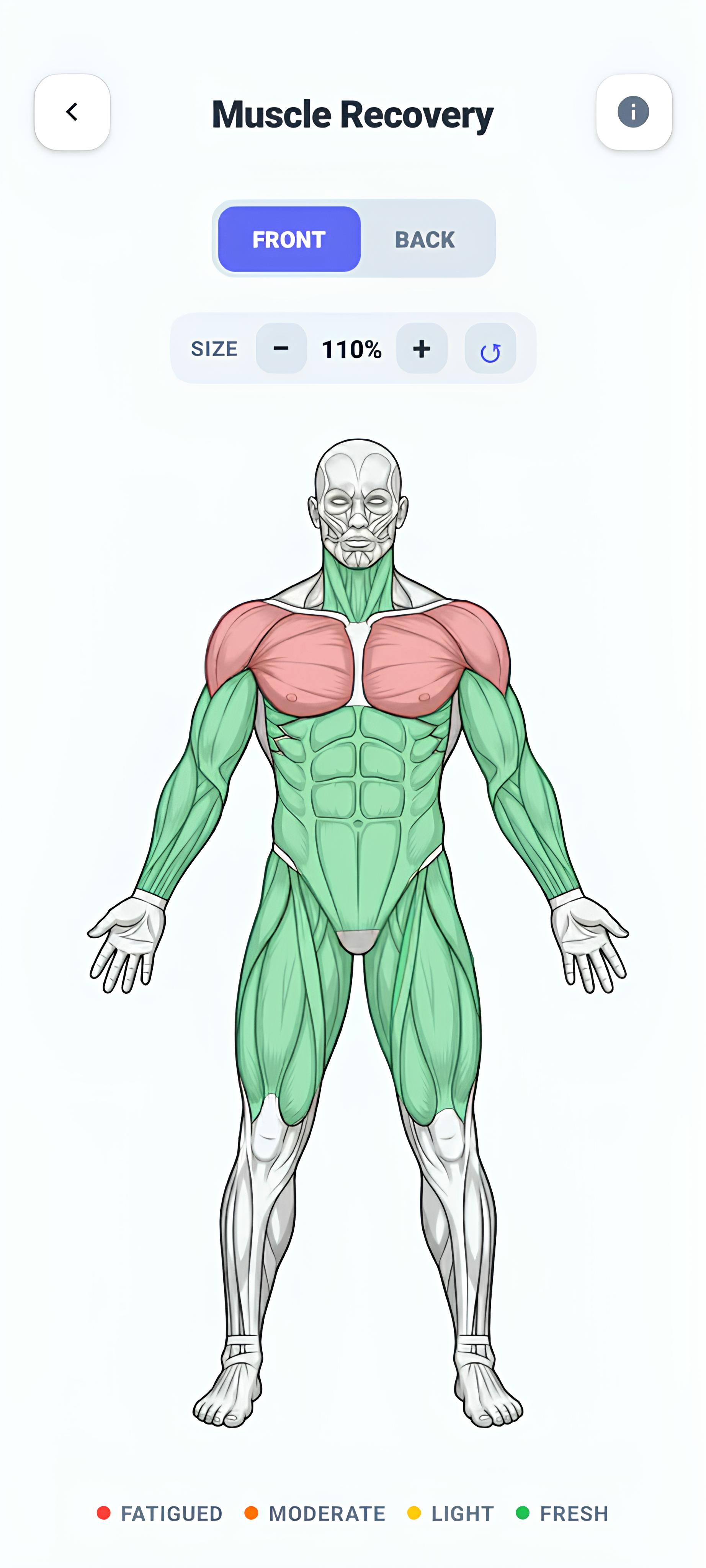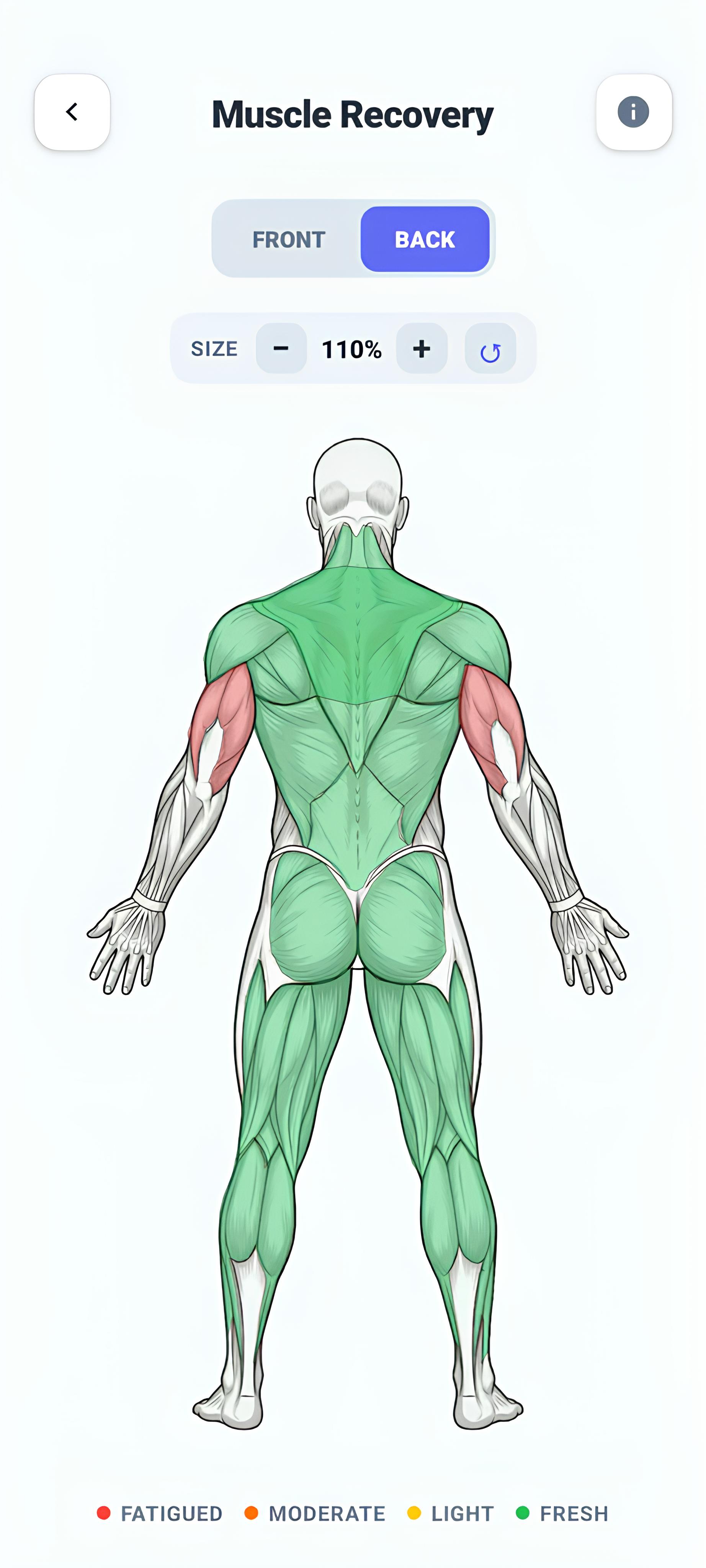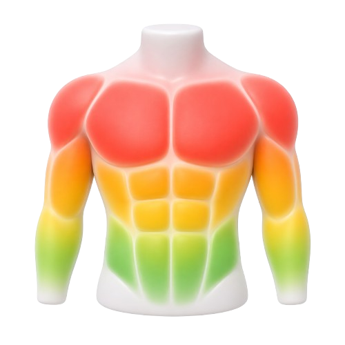 See exactly which muscles are tired. Our interactive body map shows you what's fully recovered and what needs rest β so you never train a muscle that isn't ready.