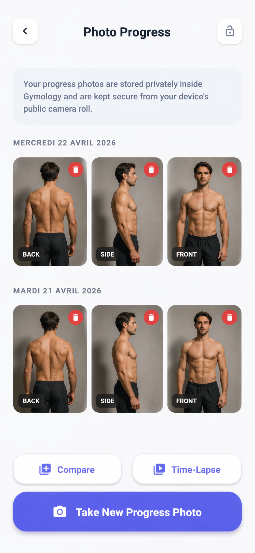 Snap daily photos and watch your body transform over time. We automatically generate a time-lapse video of your progress to share with friends.